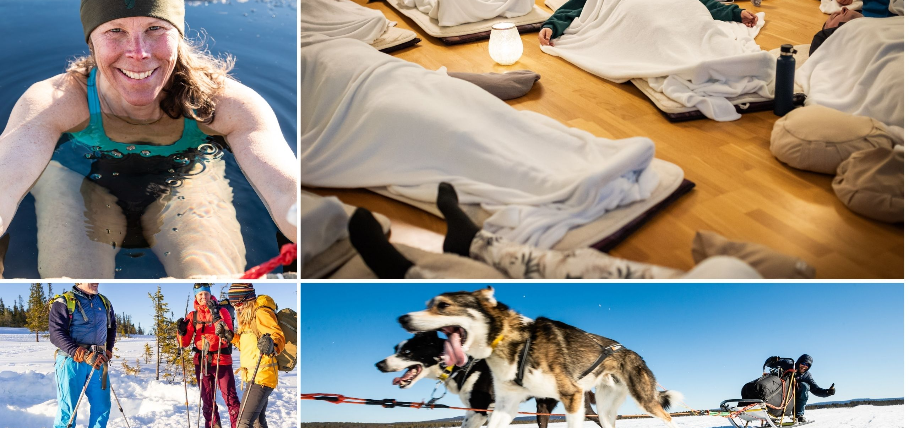 Vi kommer att varva aktiviteter som snöskopromenad med utelunch och hundspanns tur med isvaksbad, meditation och vedeldad bastu. Varje dag håller vi i andningsövningar baserade på Wim Hof metoden eller Medveten Andning. En kväll kommer vi att laga middag över öppen eld tillsammans.